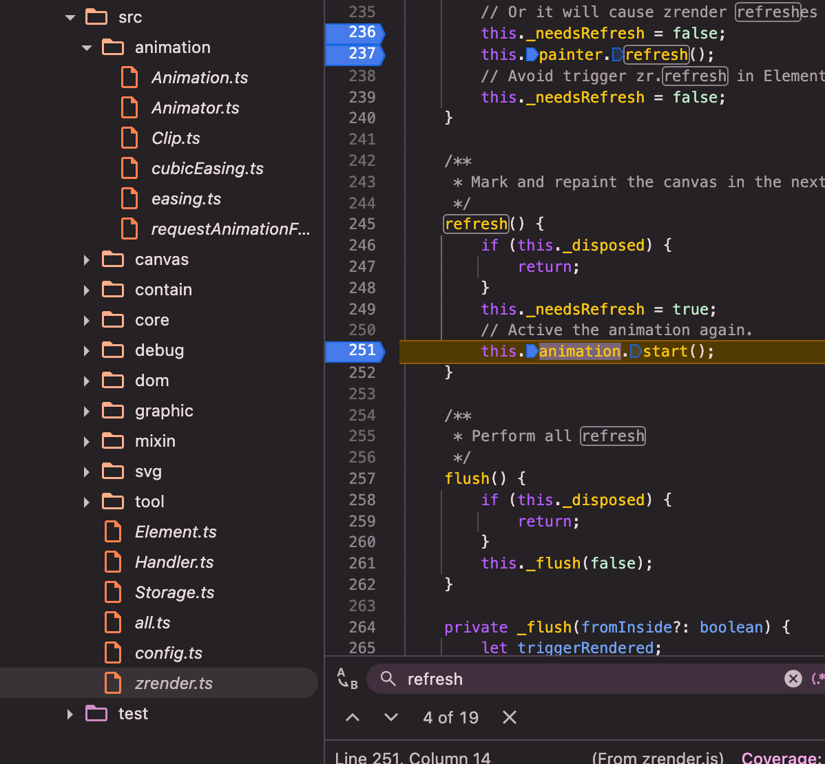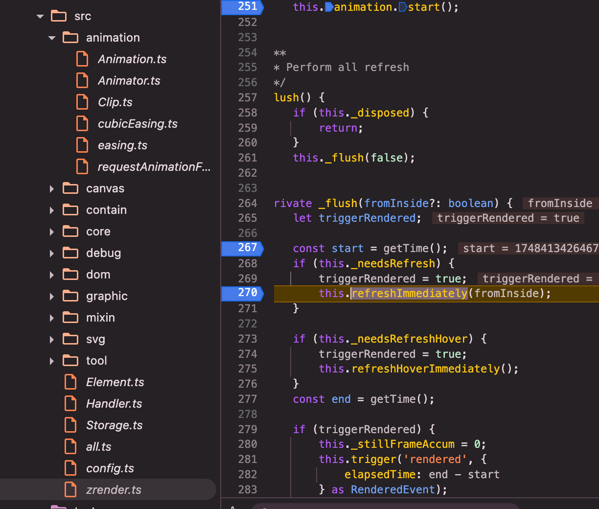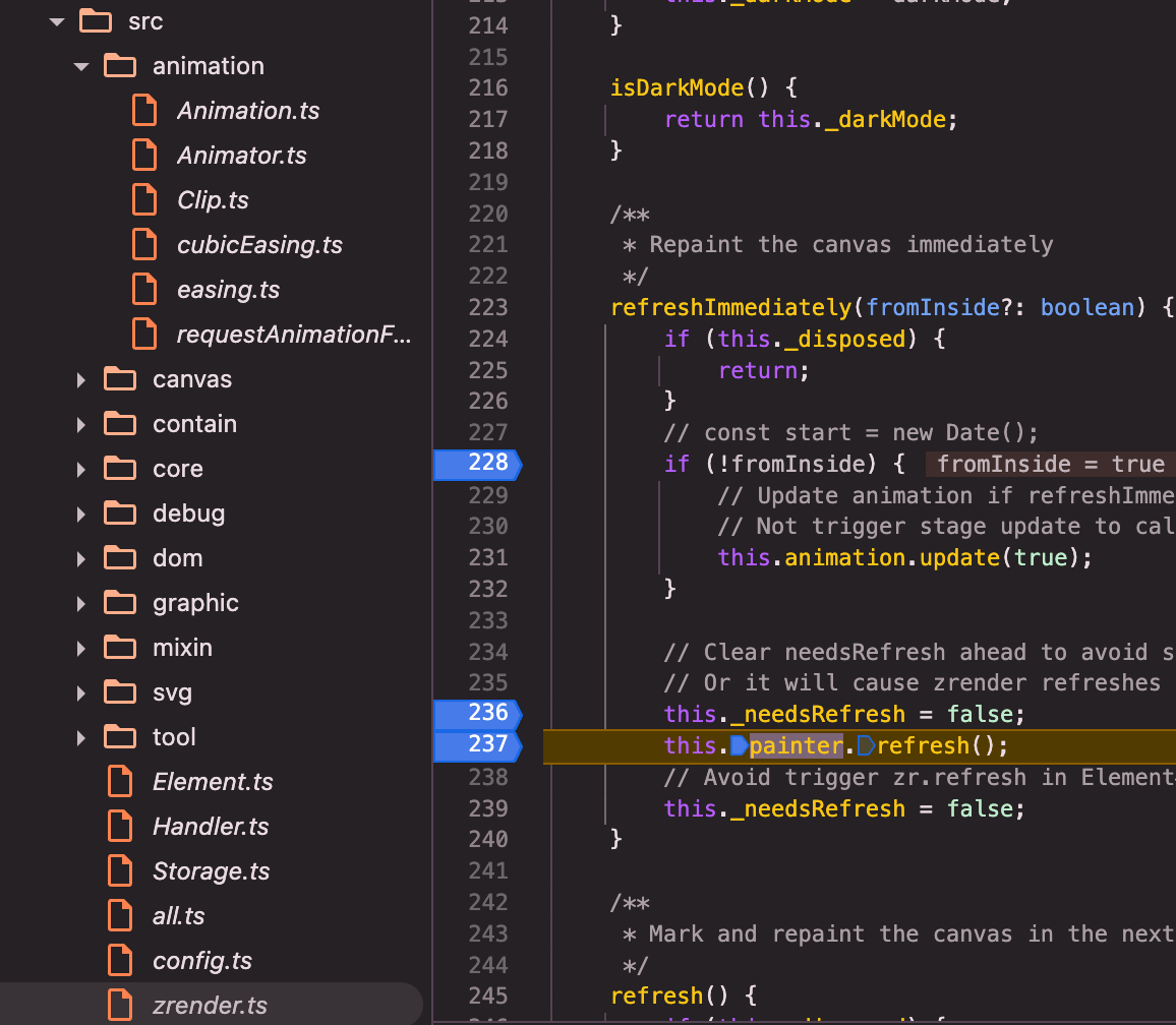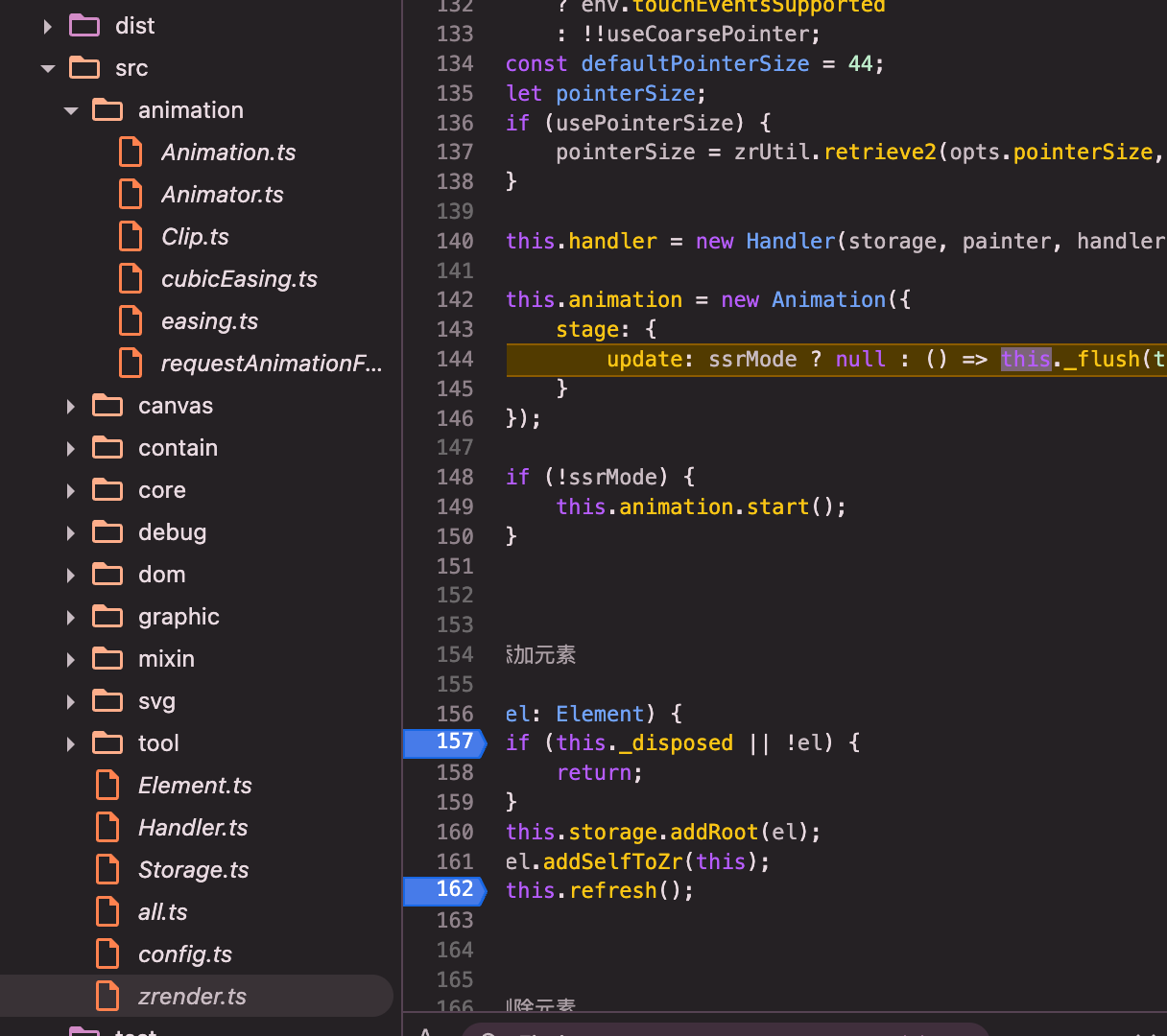 1. zrender: constructor赋值:annimation.stage.update为_flush() => _flush() => refreshImmediately() => this.painter.refresh();