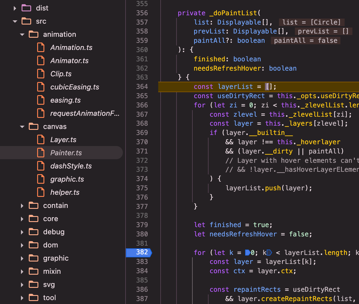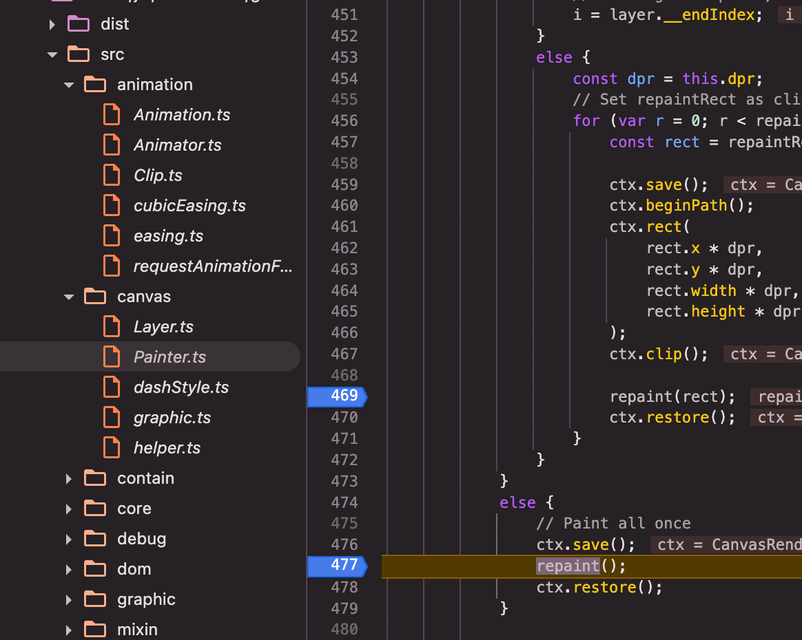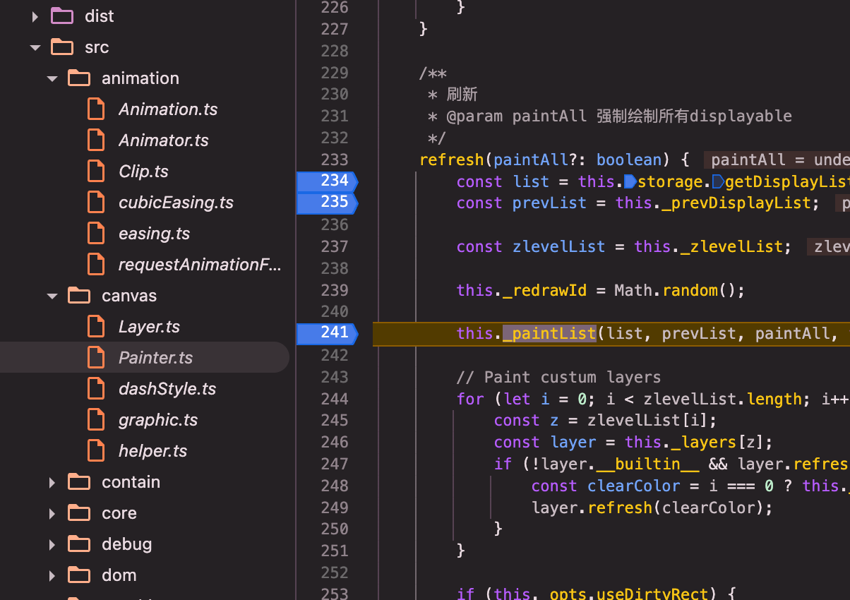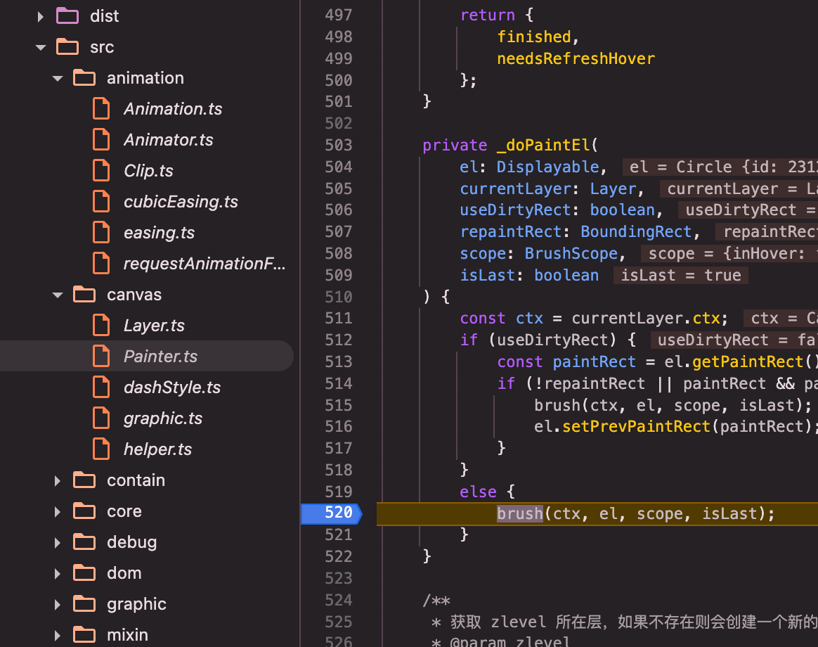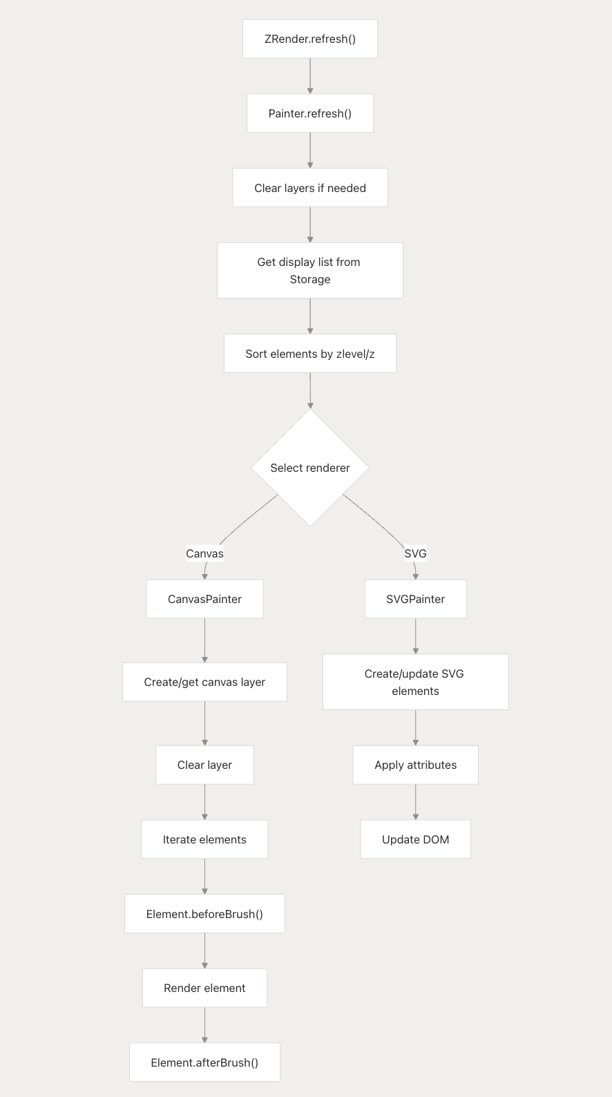 1. painter (以canvas painter为例src/canvas/Painter.ts): refresh() => _paintList() => _doPaintList() => _doPaintList内部闭包repaint() => _doPaintEl() => brush()