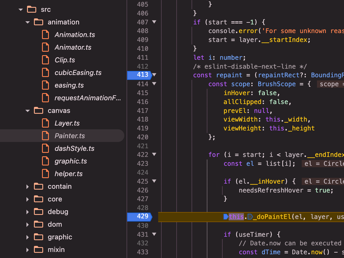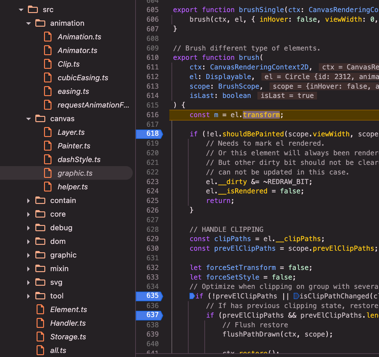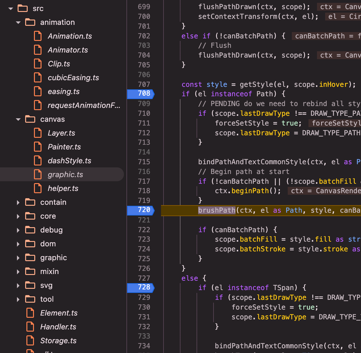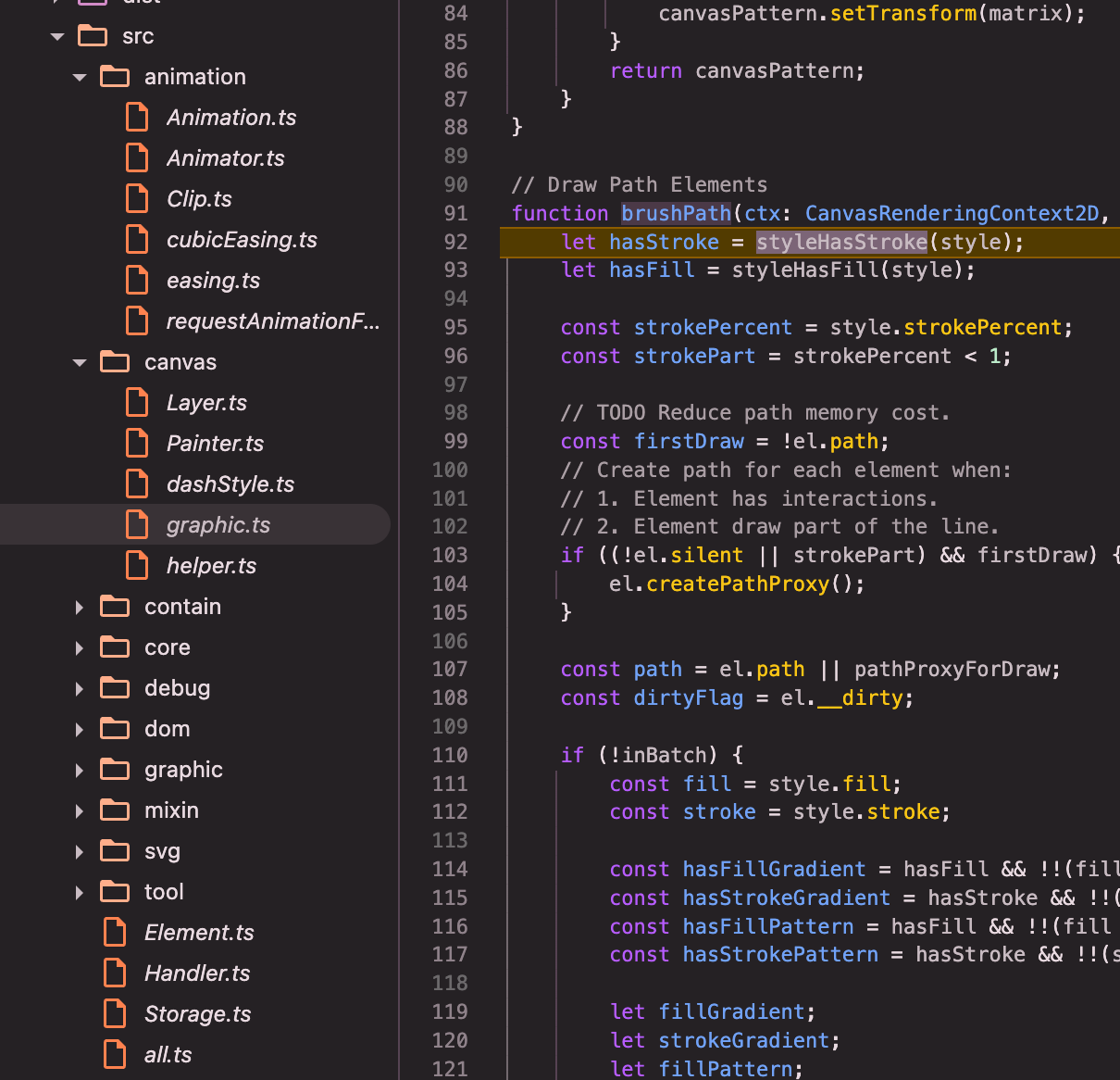 • 个人思考: 代码非常优秀,但是有点改进地方: canvas, svg, graphic 这几个目录组织不是很清晰,可能是历史原因,建议将canvassvg的绘图逻辑抽象成一个公共的graphic目录,里面包含所有的绘图逻辑,这样可以更好地复用代码,减少重复代码量;
