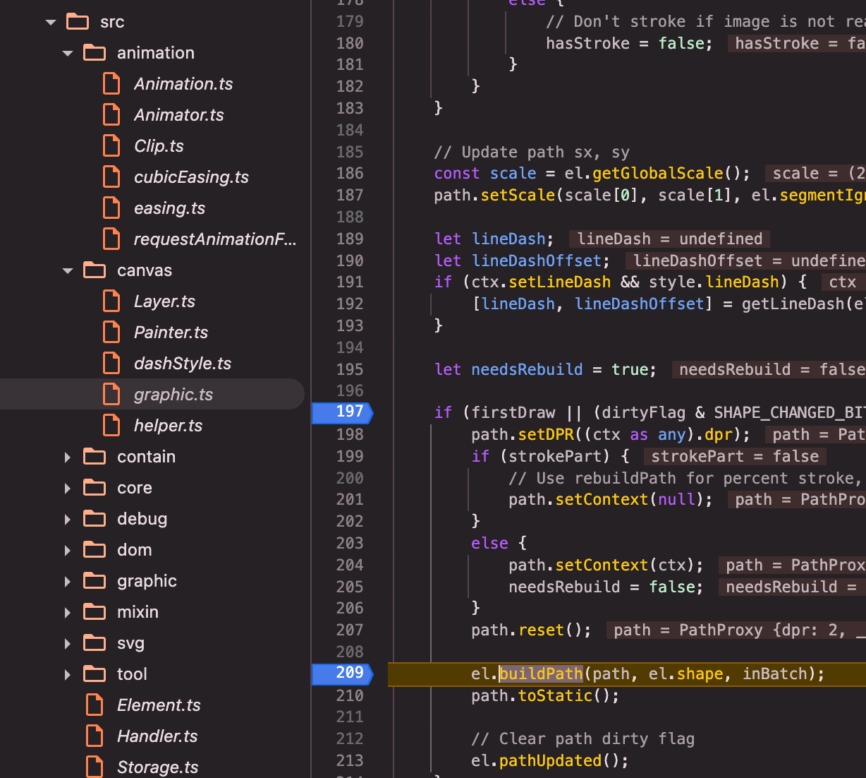 1. 动画刷新机制: 在上文解析中animation.start()开启帧动画渲染后,类似调试简单绘制过程,同样会调用: brush() => brushPath() => path.rebuildPath(ctx, strokePart ? strokePercent : 1); (在文件src/canvas/graphic.ts中) (rebuildPath这个方法比较典型, 其实也有其它子函数绘制逻辑,跟分层绘制、坐标变化等等有关)