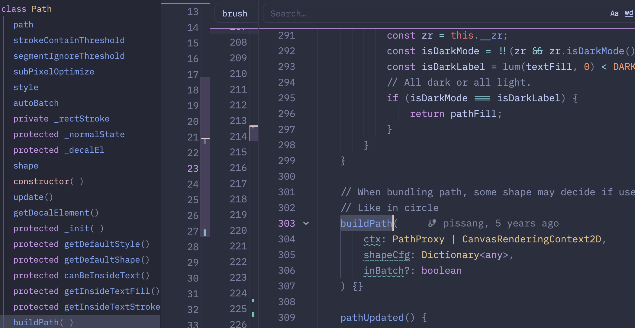1. brush() (canvas的brush, src/canvas/graphic.ts): brush() => bursh内部调用brushPath() => brushPath() => brushPath内部关键调用el.buildPath(path, el.shape, inBatch);