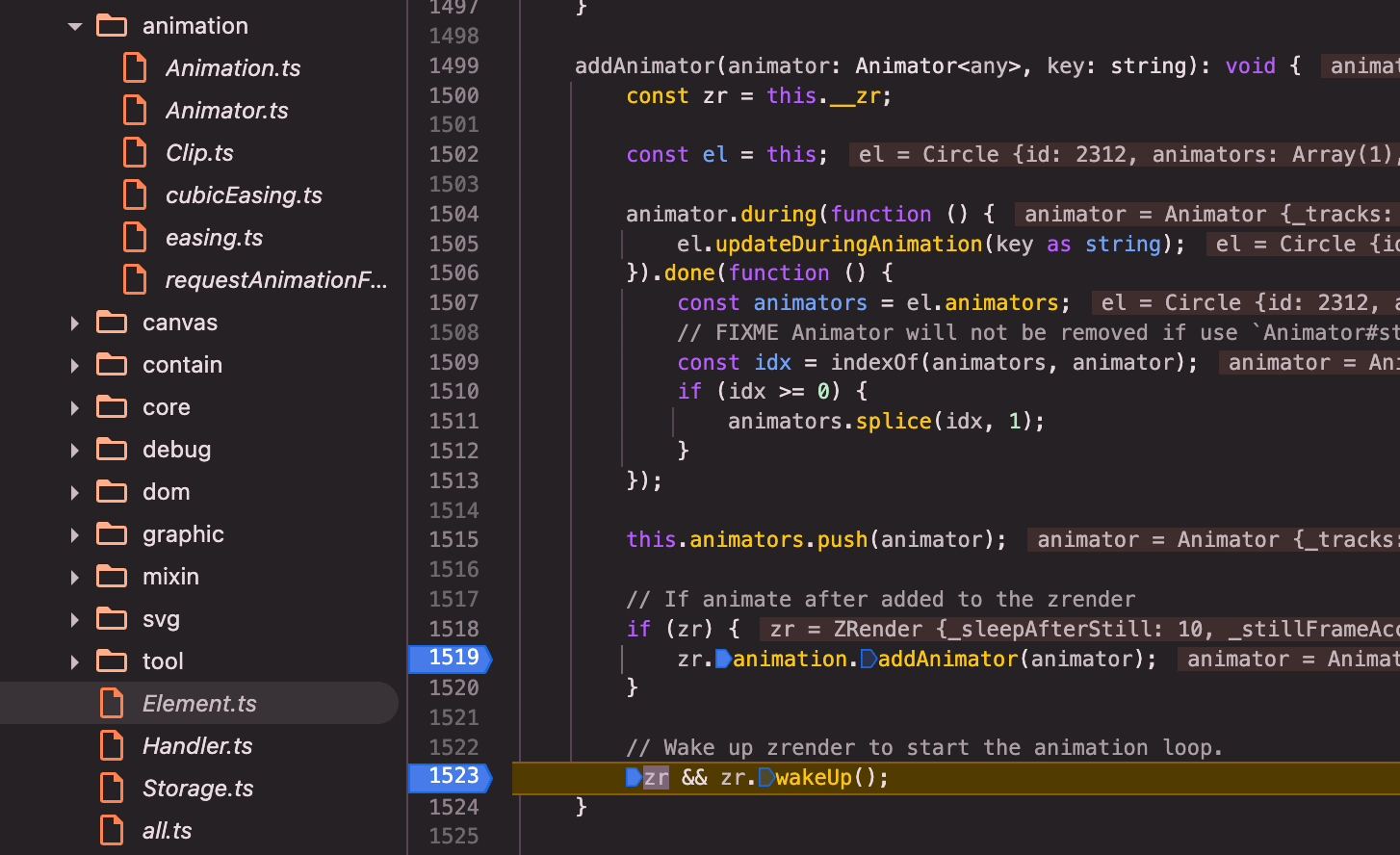 1. circle.animate() (circle是Element的子类): animate() => this.addAnimator(animator, key) => 函数内,关键调用zr.animation.addAnimator(animator)zr && zr.wakeUp();