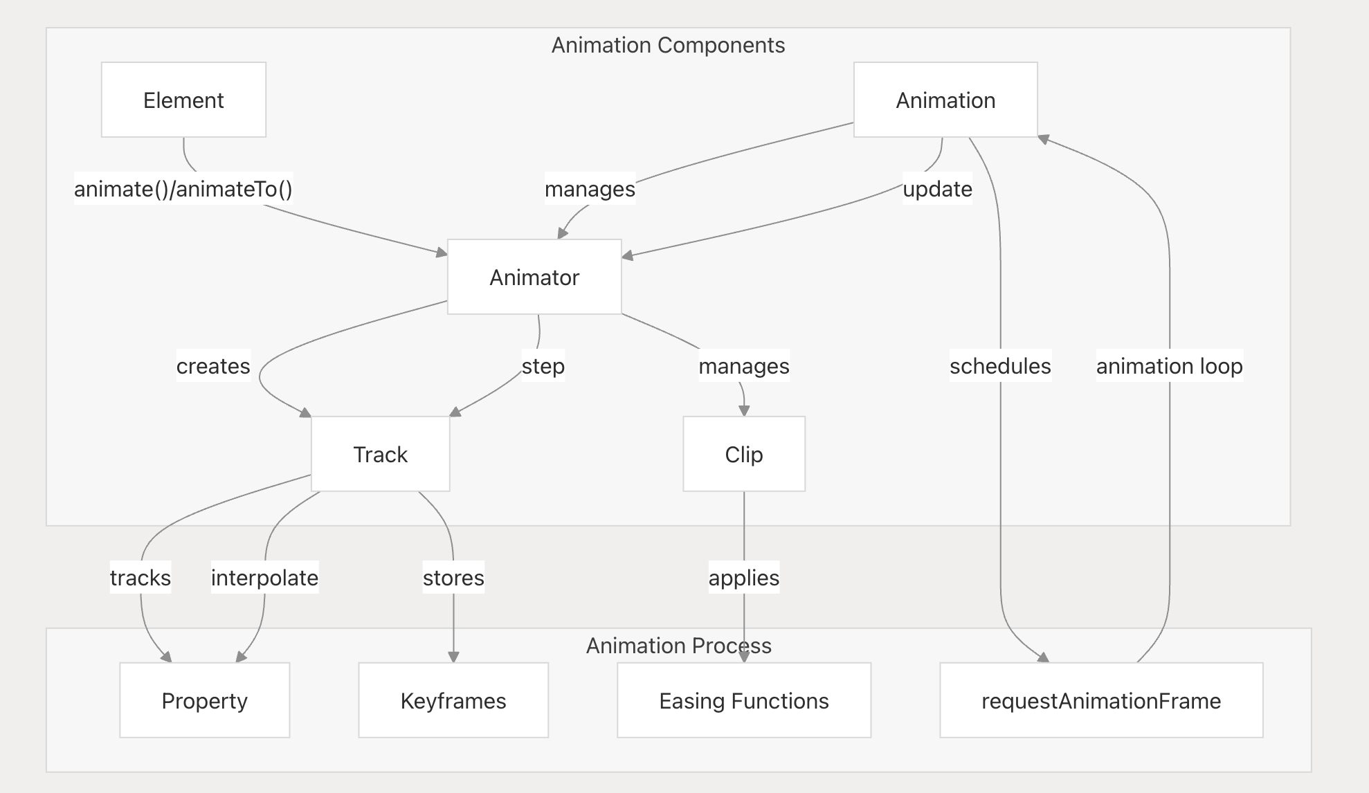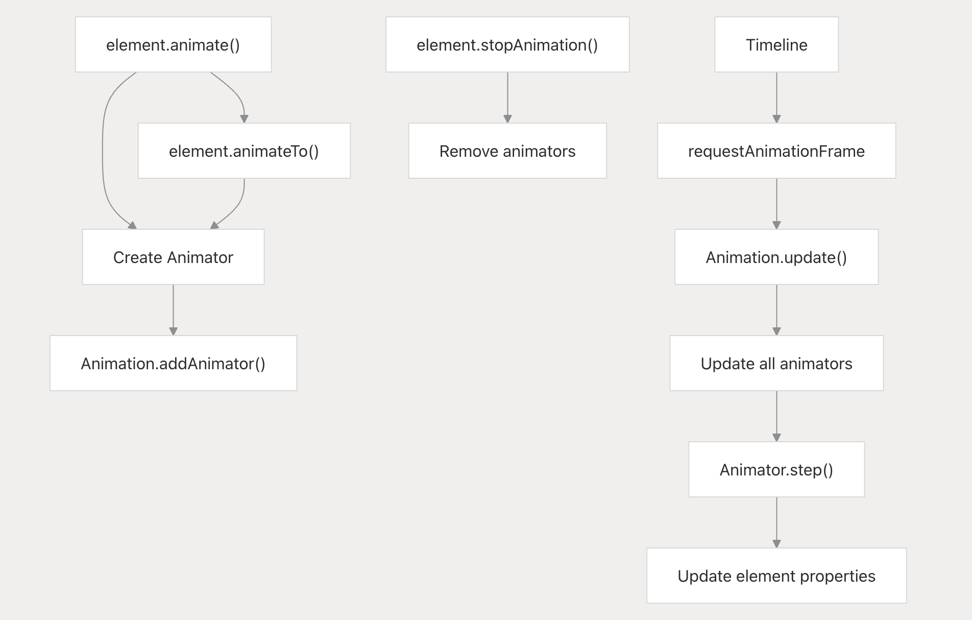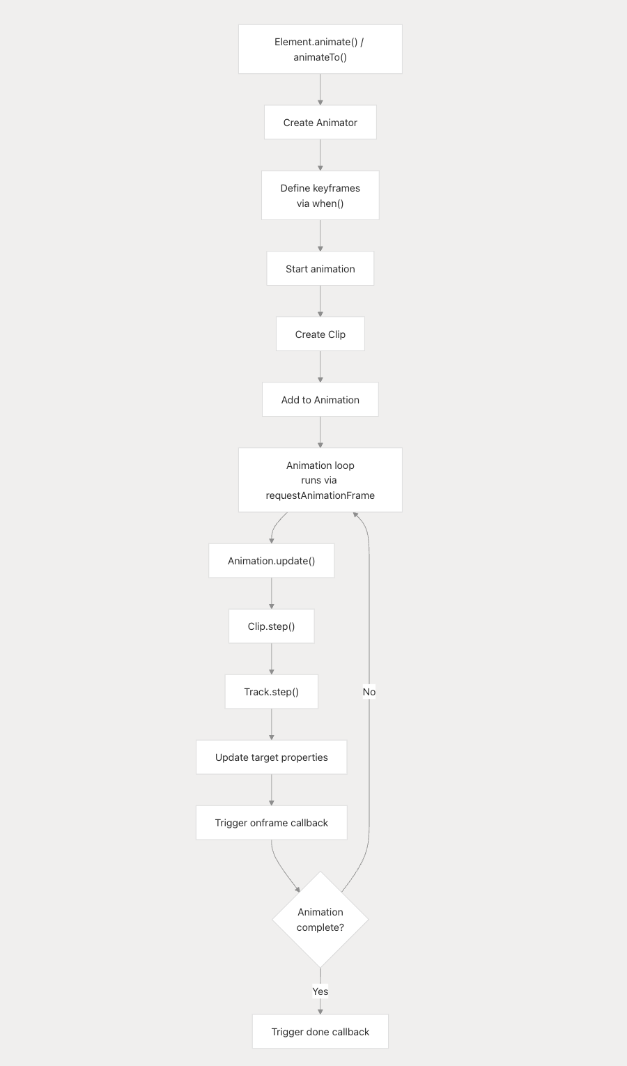 总结: 动画的绘制,主要是调用animation的start()方法实现,通过插值和重绘每一帧实现流程的动画。 每个动画都是通过requestAnimationFrame来实现的, 这个动画引擎性能很好,感觉也比较依赖浏览器的js执行效率,这说明浏览器中js的执行效率还是很高的。